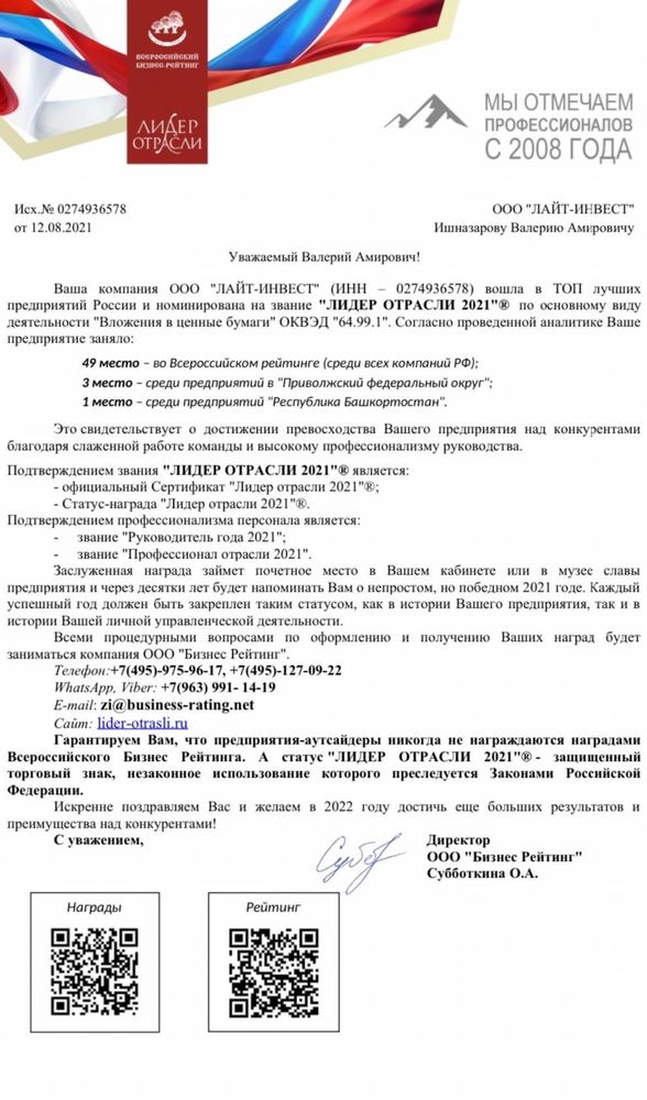 С нами в рейтинге такие известные компании как МТС, Мечел, БКС, АФК Система и Открытие Компания Лайт-Инвест растёт и развивается с каждым годом, а наши цели только начинают реализовываться
